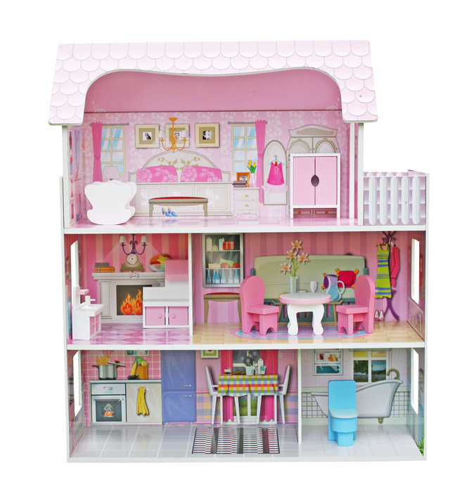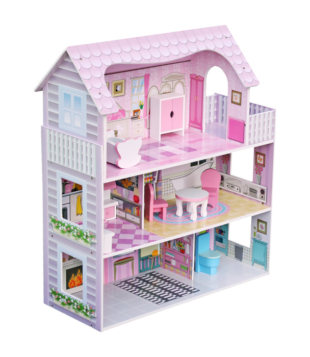 Opracowany z wielką starannością, trzypoziomowy domek posiada pięć pomieszczeń, z których każde charakteryzuje się inną stylistyką. Od kuchni, poprzez salon z kominkiem, aż po sypialnię na poddaszu z balkonem – każde pomieszczenie zostało wyposażone w pięknie wykonane drewniane mebelki, które można dowolnie przestawiać, dostosowując je do indywidualnych potrzeb i pomysłów dziecka. W komplecie znajdziesz m.in. krzesła, stolik, toaletę, łóżeczko dla niemowlaka oraz szafę na ubrania.