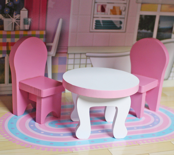 Kompletny zestaw mebelków - w skład zestawu wchodzą drewniane krzesła, stolik, łóżeczko dla niemowlaka, toaleta i szafa - wszystko, co niezbędne do pełnej aranżacji.
