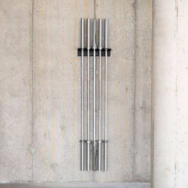 STR45 to praktyczny wieszak przyścienny, który pozwala na przechowywanie do 5 gryfów w sposób kompaktowy i bezpieczny. Dzięki swojej konstrukcji gryfy są umieszczone jeden obok drugiego, co pomaga zaoszczędzić cenną przestrzeń – szczególnie istotne w małych siłowniach i domowych strefach treningowych.