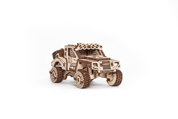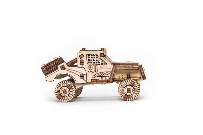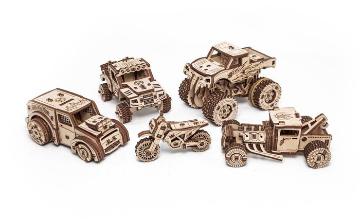 Zestaw mechanicznych drewnianych puzzli 5 w 1 małych i stylowych pojazdów do samodzielnego złożenia. Zestaw zawiera Hot Rod, Monster Truck, Prerunner, Dragster i Cross Bike.